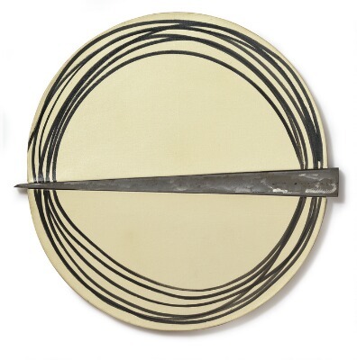 | Mixed Media on two semicircular canvases separated by an aluminum wedge | |