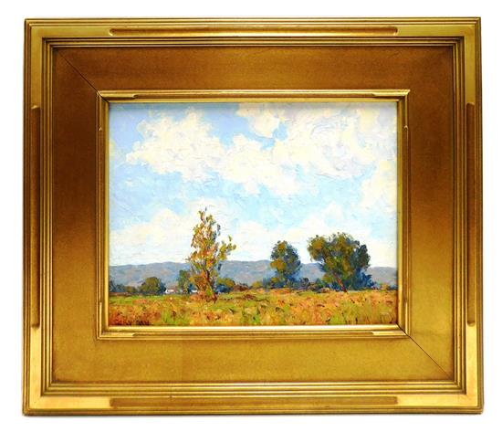 | A field with low horizon line and scattered trees, distant mountain range in background | |