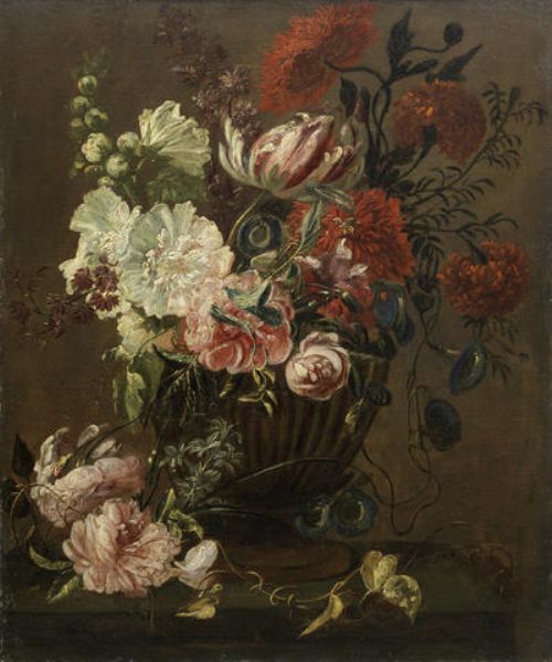 | Roses, tulips, hollyhocks, marigolds, morning glory and other flowers in fluted vases (2) | |