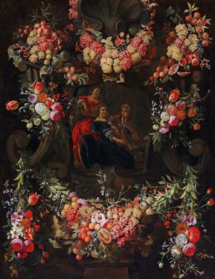 | A garland of flowers and fruit around a cartouche featuring three music-making figures | |