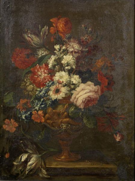 A rose, chrysanthemums, tulips and other flowers in an urn on a stone ledge