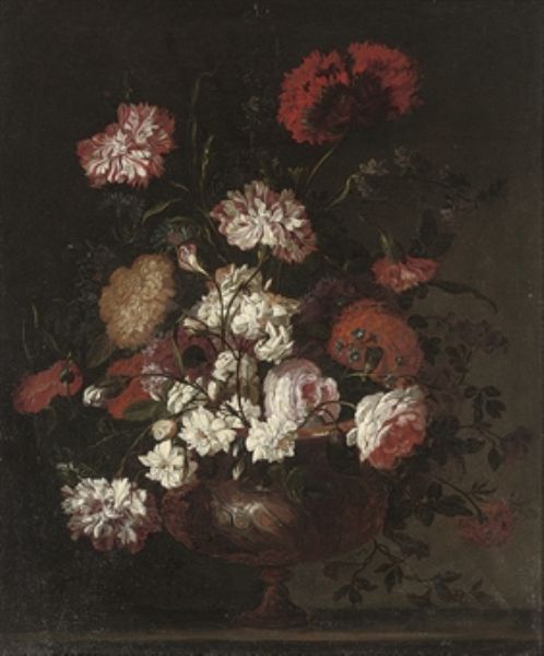 | Roses, carnations, narcissi and other flowers in a sculpted urn on a ledge | |