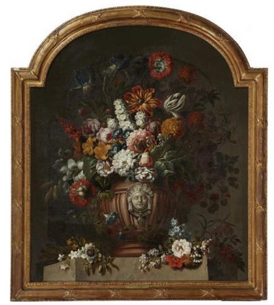 | A still life with tulips, irises and other flowers in an urn arched top | |