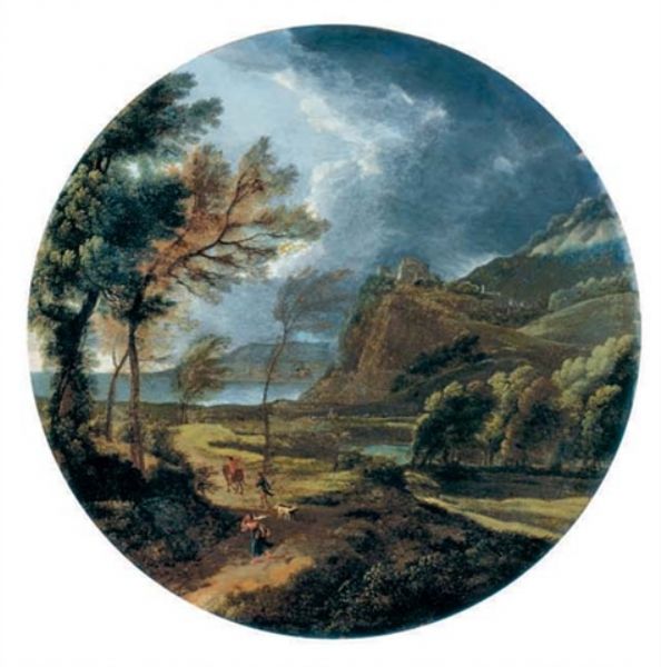 A stormy landscape with travelers by a cliff