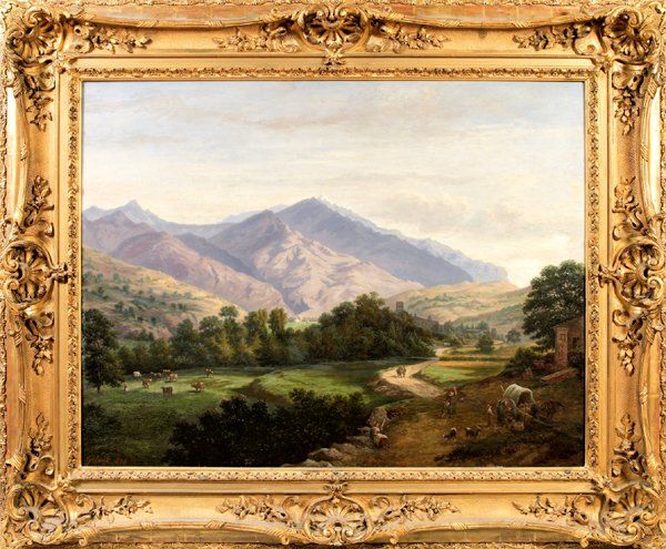 | Paysage alpin avec troupeau, personnages et charrette dans une vallée | |