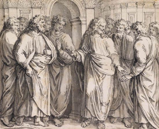 | Pen and black ink and gray wash on cream laid paper mounted on heavy laid paper | |