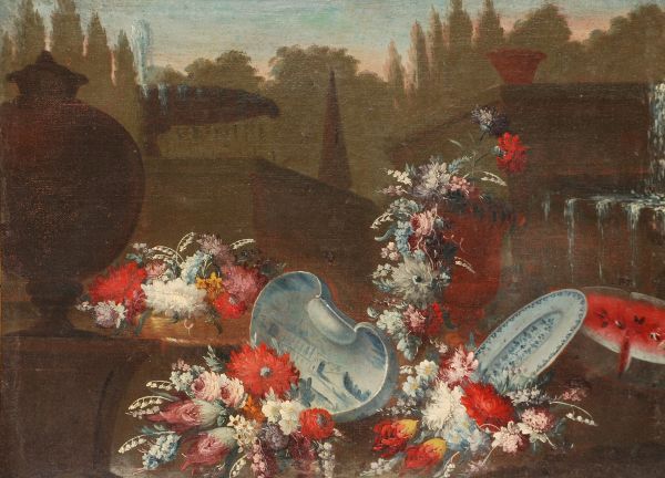 | Still life in a garden setting with an array of flowers spilling from a sculpted urn and a basket together with other items | |