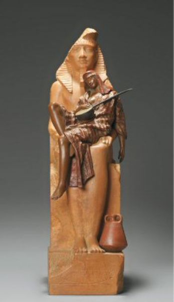| Jeune femme fellah tenant une cithare, endormie sur les genoux d'un des colosses de Memnon. | |