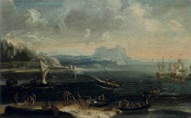 | Paesaggio costiero con una reminiscenza del Monte Pellegrino con navi in mare e vascelli all'ancora | |