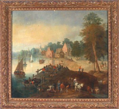 Reges Treiben am Ufer vor einem Dorf mit zahlreichen Personen und Tieren