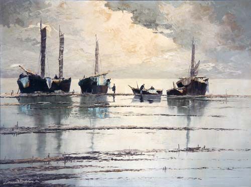 Fischer mit ihren Booten im Morgengrauen