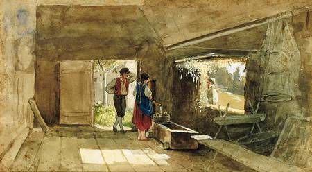 | Blick in die Brunnenstube eines Fischers mit aufgehängten Reusen und Personenstaffage | |