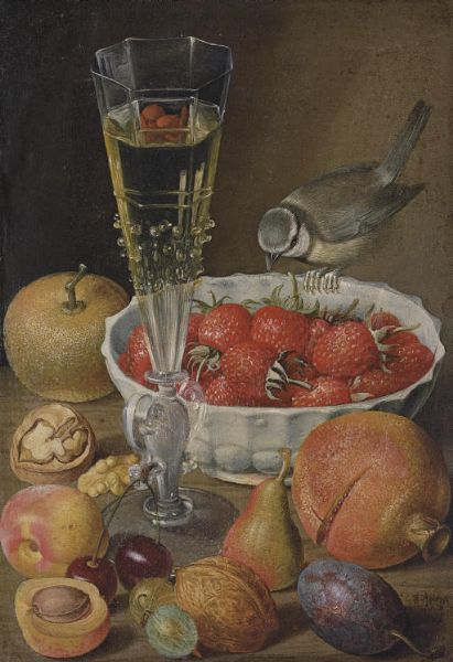 | A façon de venise, a bowl of strawberries, a blue tit, a pomegranate, cherries, other fruits and walnuts on a table | |