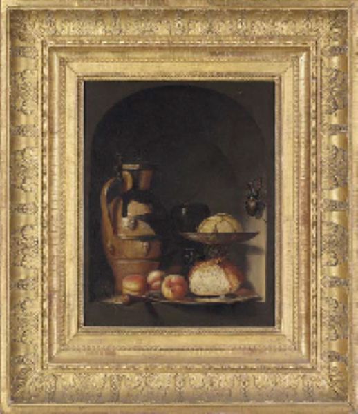 | An earthenware jug, a glass roemer, a silver tazza, a pewter plate with bread and peaches, a mouse and a stag-beetle in a caseme | |