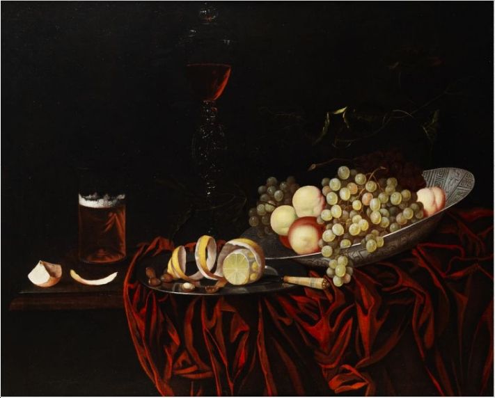 GROSSES FRÜCHTESTILLEBEN MIT GLASPOKAL, BIERGLAS UND ZITRONE