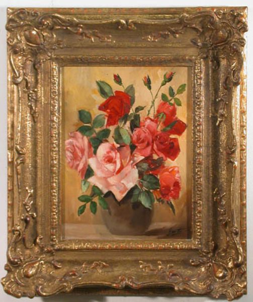 Rosenstrauß in kugeliger Tonvase.