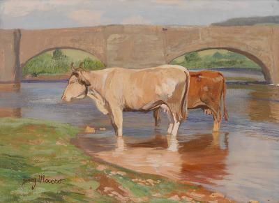 Kühe im Wasser bei einer Steinbrücke.