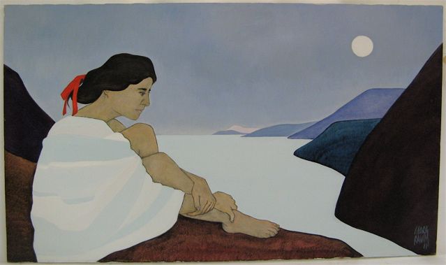 | Woman with red ribbon in her hair, seated, on promontory over lake with mountains in the distance | |