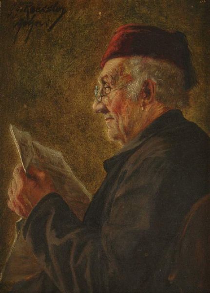 Kaufmann, schmunzelnd seine Zeitung lesend.