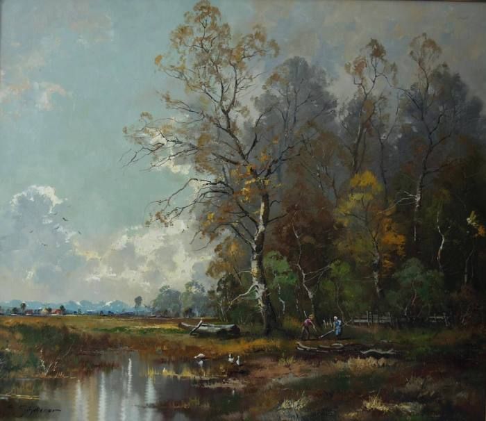 Voralpenlandschaft mit Personenstaffage und drei Enten.