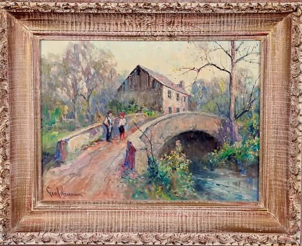 | Achey Grist Mill, Milford Square, Pennsylvania, two figures on bridge | |