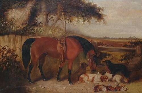 After a days shooting; A chestnut hunter and dogs before a stable