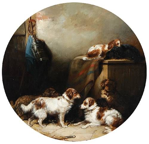 Dogs in a stable interior
