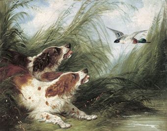 Spaniels surprising a duck