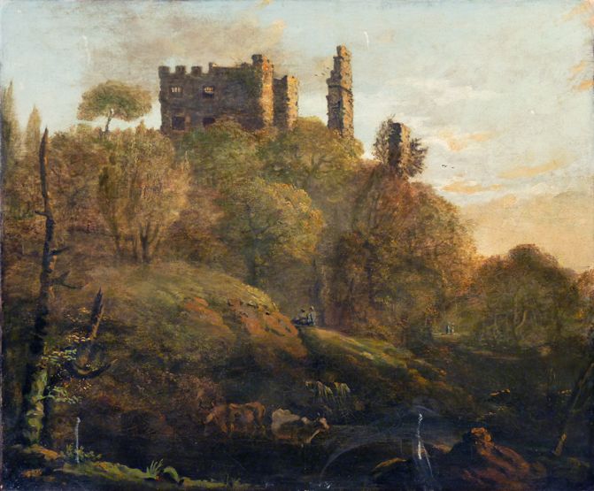 | A WOODED LANDSCAPE WITH FIGURES NEAR CASTLE RUINS, CATTLE IN THE FOREGROUND | |