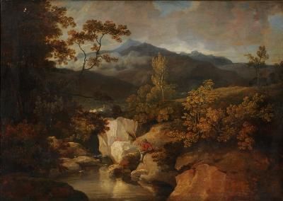 | An upland landscape, fisherman by a rocky stream in the foreground, buildings in the middle distance, hills beyond | |