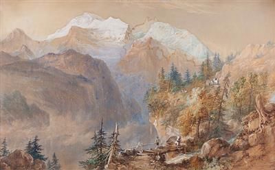 Brücke über dem Staubachfall in der Schweiz mit Figurenstaffage