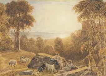 | A shepherd and sheperdess with their flock in an Arcadian landscape | |