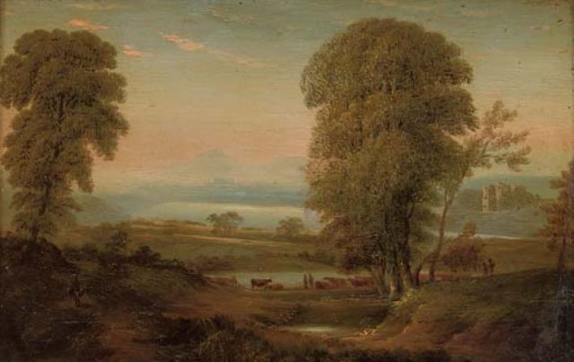 | A view in County Wicklow with figures and cattle in the foreground and a ruin to the right | |