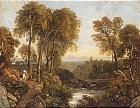 | FIGURES ON A WOODED PATH BY A RIVER, A CASTLE AND MOUNTAINS BEYOND | |