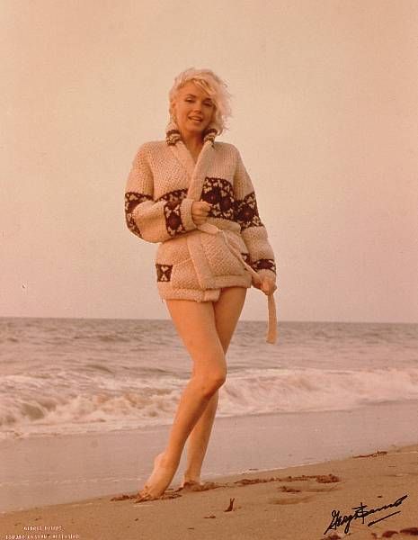 | Marilyn Monroe, standing by the water`s edge, wearing a knitted jacket | |