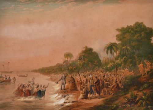 | The Rev. J. Waterhouse Superintending the landing of the Missionaries at Taranaki, New Zealand | |
