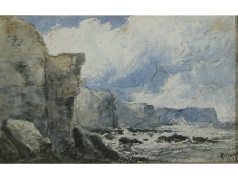 A WATERCOLOUR SKETCH depicting steep cliffs, choppy sea and billowing clouds