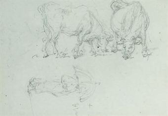 | Study of cattle and a figure walking with a parasol (illustrated); and Study of a hat | |