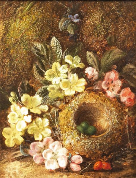 STILL LIFE OF A BIRD'S NEST AND PRIMROSES ON A MOSSY BANK