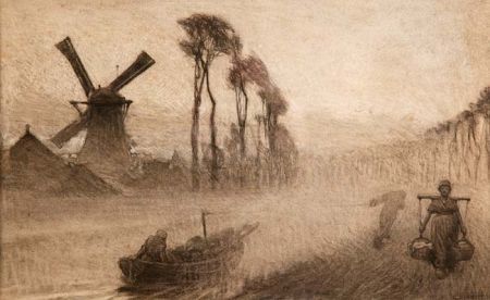 | A Dutch Canal Scene with Figures, Barge and Windmill | |
