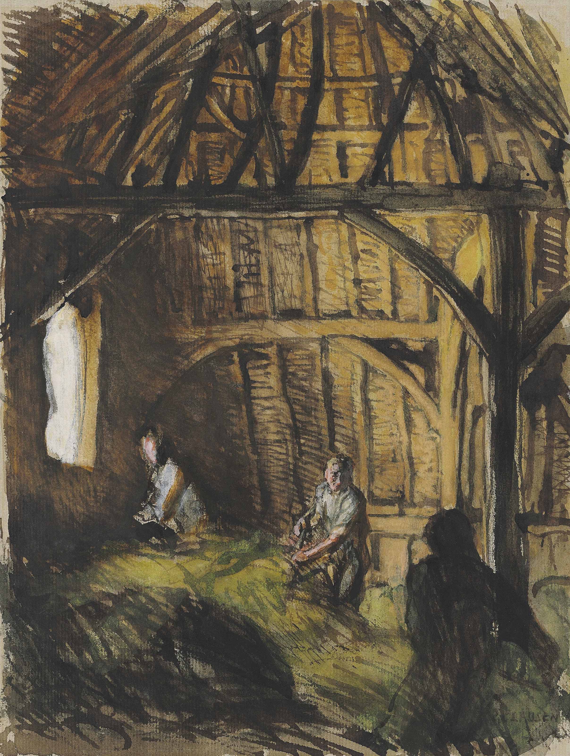 | Study of a barn interior with figures turning the hay | |