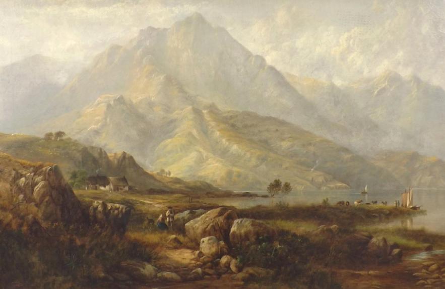 | Loch scene with figures and a dog beside rocks, cattle and a Highland croft nearby with the mountains in the distance | |