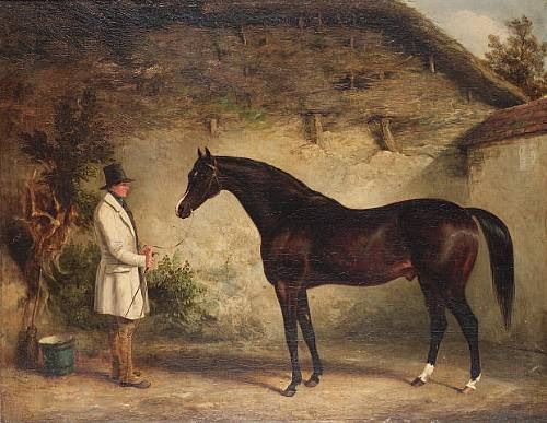 Portrait of the dark bay horse 'Venison', standing with a groom