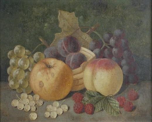 Still Life of Apples, Plums, Raspberries and Grapes on a Ledge