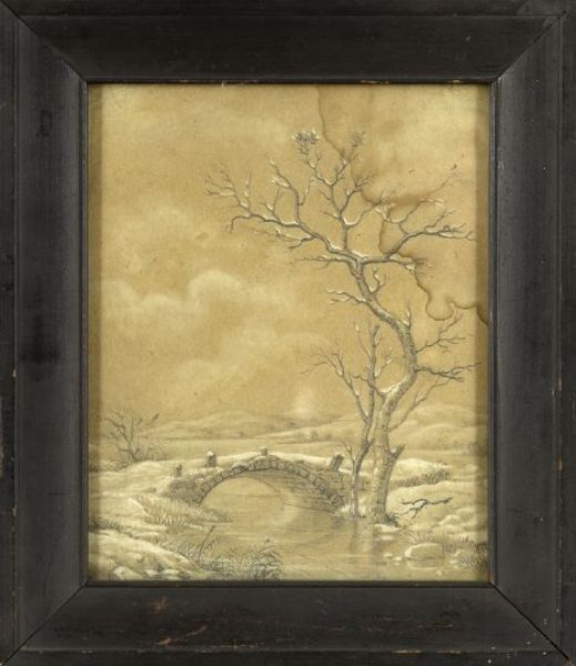 | Snow Covered river Landscape with a Bridge and "Winter Scene with a Figure Walking on a Village Road" | |