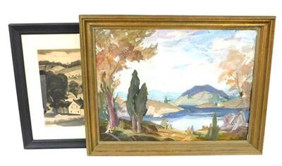 George Davidson (Polish-American, 1889-1965) two works including charcoal drawing on paper, depicting man working in field, houses and hilly landscape in background, signed LL, not examined out of frame, ss: 15 1/2" h. x 20" w.; oil on canvas landsca | |