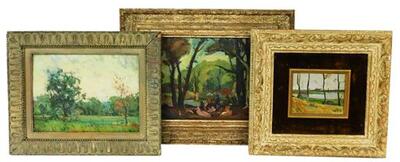 George Davidson (Polish-American, 1889-1965), three framed oil on board landscapes, unsigned: first, a wooded landscape with figure at center, painted Heydenryk frame, ss: 9" h. x 13" w.; scene with four trees in front of river, buildings on horizon | |