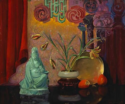 A Still Life including A Jade Buddha, Persimmons, and a Brass Platter