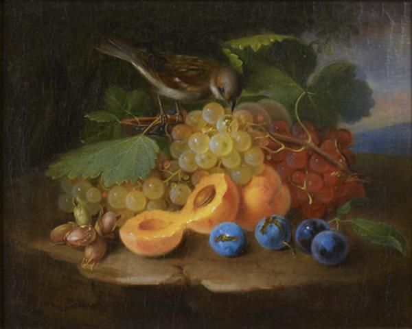 | Nature morte aux raisins, abricots, quetsches, noisettes et oiseau | |