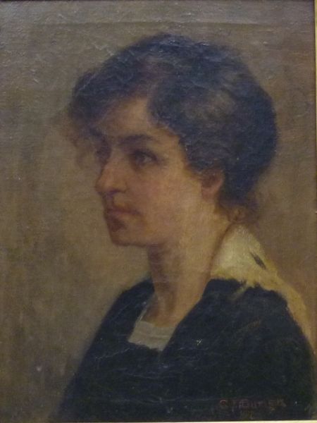A head and shoulders study of a young woman with dark hair in a sailor ou
